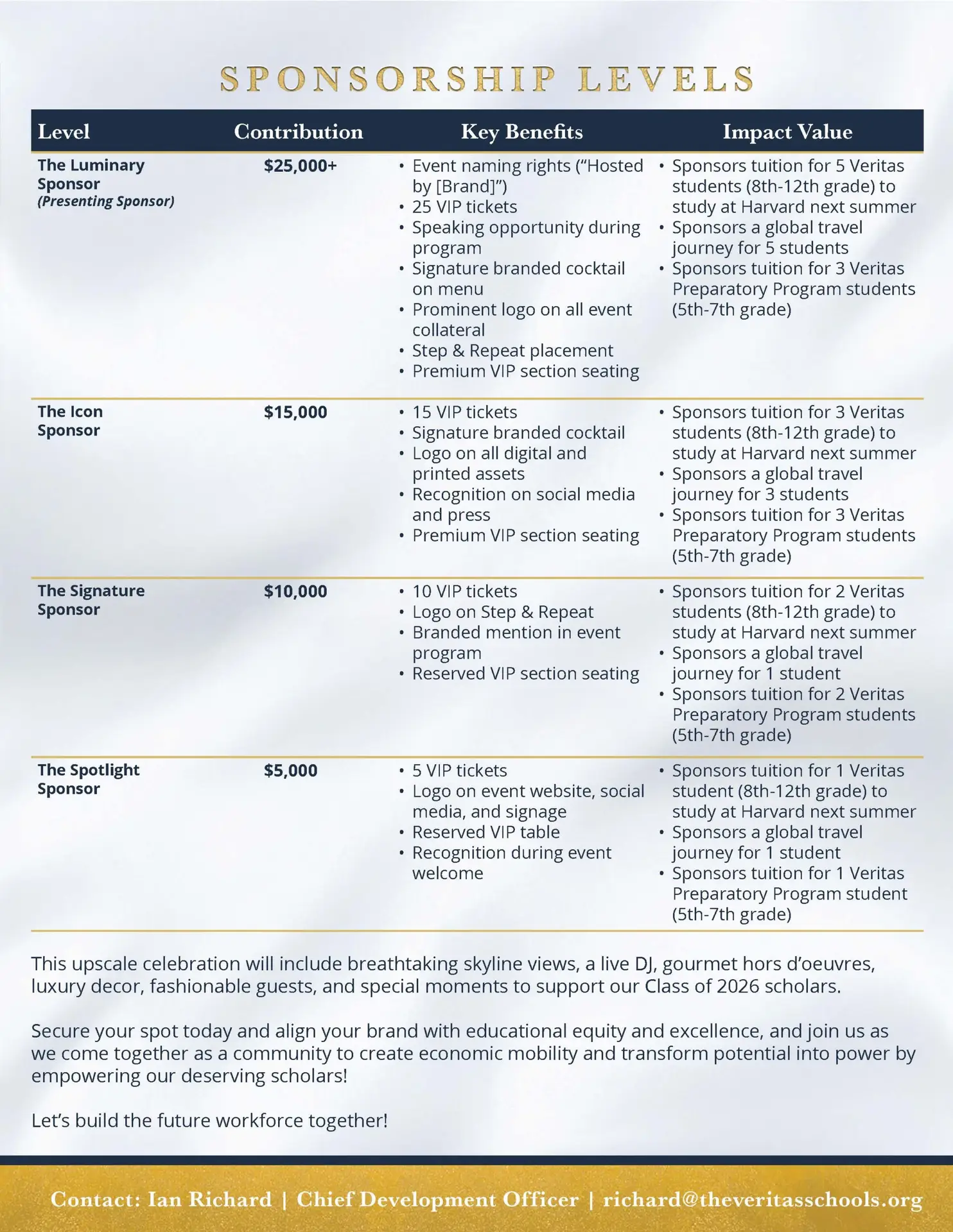This upscale celebration will include breathtaking skyline views, a live DJ, gourmet hors d’oeuvres, luxury decor, fashionable guests, and special moments to support our Class of 2026 scholars.